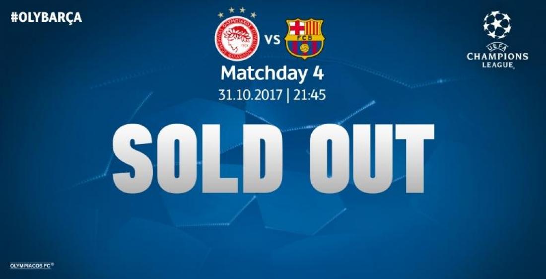 " Η ΠΑΕ Ολυμπιακός ανακοινώνει την εξάντληση των εισιτηρίων για την 4η αγωνιστική του εφετινού UEFA Champions League και τον αγώνα με αντίπαλο την Μπαρτσελόνα, στο γήπεδο Καραϊσκάκη ".