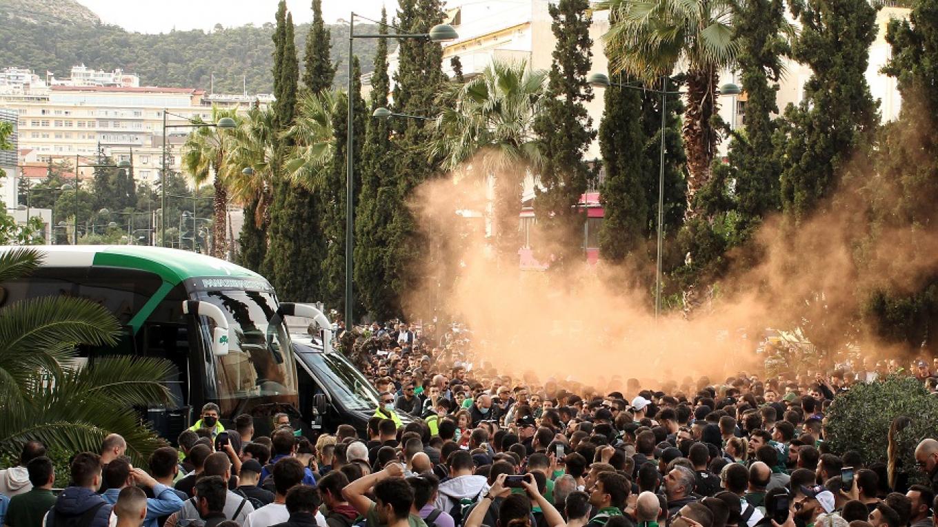 Οι φίλοι του Παναθηναϊκού φώναξαν δεκάδες συνθήματα, άναψαν φωτοβολίδες, ενώ τραγούδησαν και τον ύμνο του συλλόγου. Πάντα όλα αυτά από απόσταση, καθώς η «πράσινη» ΠΑΕ είχε φροντίσει να τοποθετήσει κάγκελα γύρω από το πούλμαν, προκειμένου ο κόσμος να μην μπορέσει να προσεγγίσει τους ποδοσφαιριστές και το επιτελείο και υπάρξει περαιτέρω διασπορά του κορωνοϊού μετά τα πολλά κρούσματα στο «τριφύλλι».