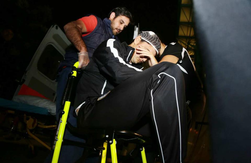 Ο Σέρβος προπονητής έπεσε στο έδαφος σφαδάζοντας από τον πόνο, την ώρα που ένας σεκιούριτι του γηπέδου προσπαθούσε να συνετίσει τους οπαδούς σε εκείνο το σημείο.