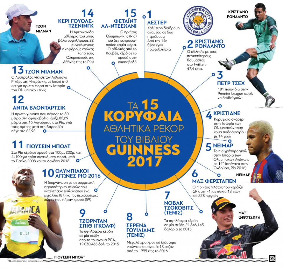 Λέστερ, Κριστιάνο Ρονάλντο, Πετρ Τσεχ, Νόβακ Τζόκοβιτς, Γιουσέιν Μπολτ και Νειμάρ μοιράζονται τα φώτα της δημοσιότητας με διάφορους «ανώμυνους» αθλητές, στα 15 καλύτερα αθλητικά ρεκόρ στο βιβλίο Guinness 2017, όπως τα παρουσιάζει η ισπανική εφημερίδα "Marca":