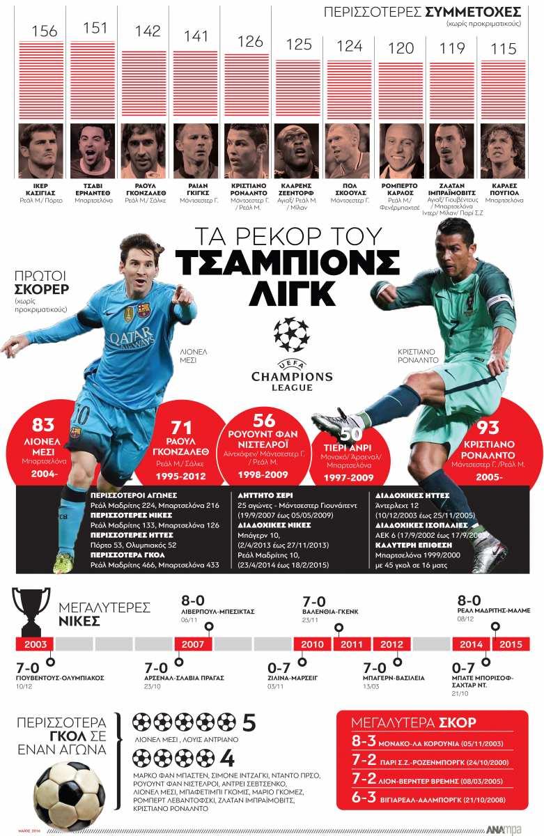 Το γράφημα αποτυπώνει στατιστικά στοιχεία για τις επιδόσεις ομάδων και παικτών στην ιστορία της σημαντικότερης ευρωπαϊκής διοργάνωσης ποδοσφαιρικών συλλόγων.