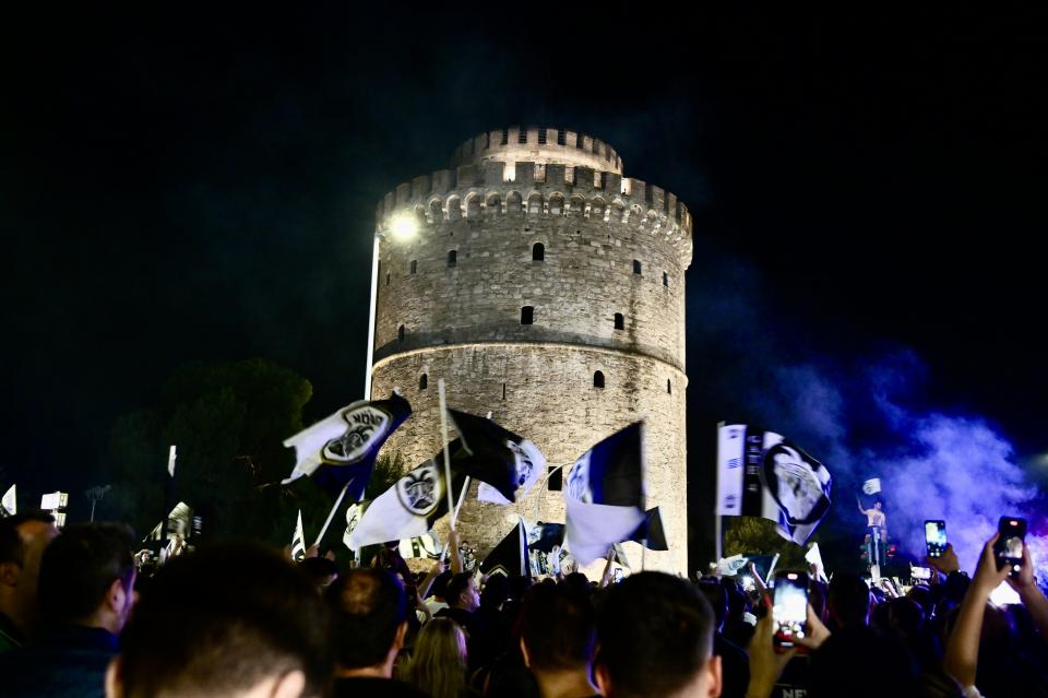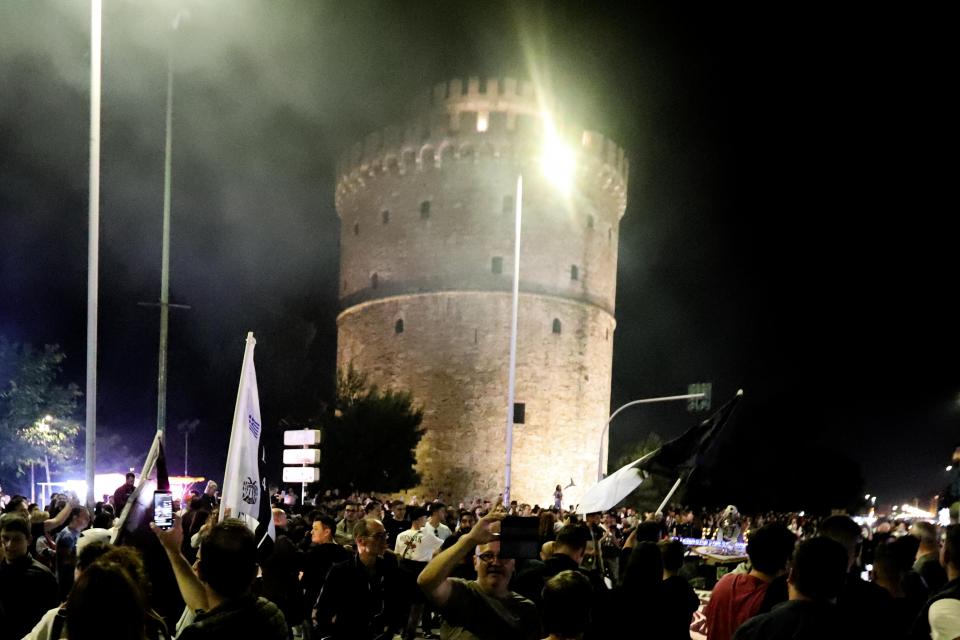 Στο Λευκό Πύργο ήδη άρχισαν αν συγκεντρώνονται φίλοι του ΠΑΟΚ που πανηγυρίζουν για την επιτυχία της ομάδας τους.