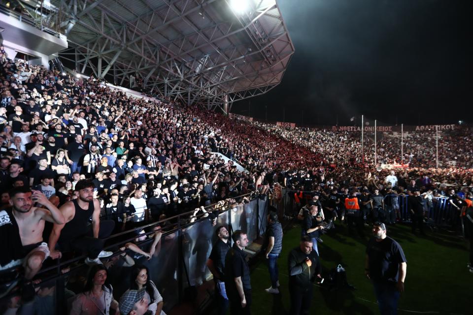 Κάδοι απορριμμάτων έχουν μετακινηθεί και τοποθετηθεί σε σταυροδρόμια από φιλάθλους και κάποια πυροτεχνήματα έπεσαν στο Λευκό Πύργο, ενώ φίλαθλοι πανηγυρίζουν και τραγουδούν στην παραλιακή και στην οδό Νικολάου Γερμανού, που έχουν κλείσει από κόσμο, στο ύψος του Λευκού Πύργου.