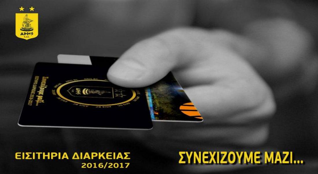 Η ανακοίνωση "Η διάθεση των εισιτηρίων διαρκείας για την αγωνιστική περίοδο 2016-17 συνεχίζεται με αμείωτους ρυθμούς. Η ΑΡΗΣ Κ.Α.Ε. βρίσκεται στην ευχάριστη θέση να ανακοινώσει ότι σήμερα Πέμπτη (22/09) "έσπασε το φράγμα" των 2.000 εισιτηρίων. Η διάθεση των εισιτηρίων συνεχίζεται μέσω της ARIS BC Boutique "The Legend Store " και ηλεκτρονικά μέσω της VIVA . Η ανταπόκριση του κόσμου στην προσπάθεια του ΑΡΗ είναι εντυπωσιακή και η συνέχεια αναμένεται ανάλογη. Σας ευχαριστούμε!"