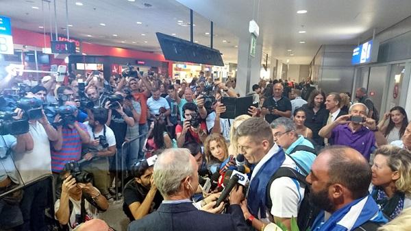 Έχοντας τη γαλανόλευκη περασμένη στον λαιμό του και ένα χαμόγελο ευτυχίας ζωγραφισμένο στο πρόσωπό του, ο Σπύρος Γιαννιώτης εμφανίστηκε στην αίθουσα αφίξεων και τα χειροκροτήματα και τα μπράβο από εκείνους που χάρηκαν με τη χαρά του, περίσσεψαν.