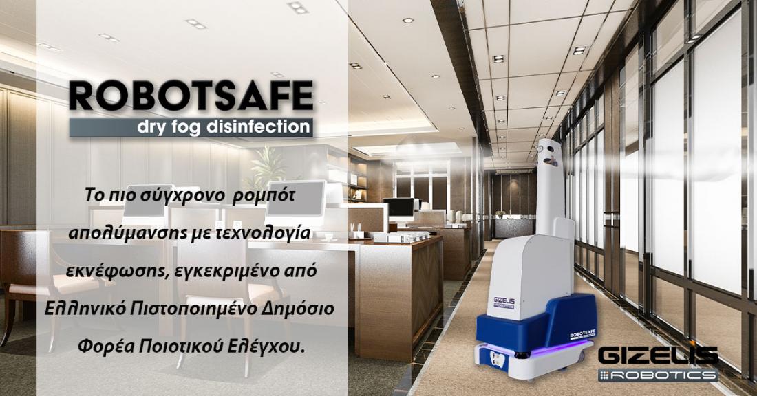 Το Robotsafe είναι το 1ο αυτοκινούμενο συνεργατικό Robot που έχει κατασκευαστεί για εσωτερική απολύμανση σε εταιρικούς χώρους, εγκαταστάσεις, βιομηχανίες, αποθήκες, εργοστάσια, κέντρα διανομής, αεροδρόμια και υγειονομικούς χώρους. Η προηγμένη τεχνολογία που ενσωματώνει, μέσω αλγορίθμων τεχνητής νοημοσύνης, του επιτρέπει να αποφεύγει εμπόδια και να επανασχεδιάζει δυναμικά τη διαδρομή που πρέπει να ακολουθεί στο χώρο, παρέχοντας έτσι κορυφαία ασφάλεια χρήσης και προστασίας. Το Robotsafe με την τεχνολογία ψεκασμού ξηρού νέφους, μπορεί και διεισδύει σε περιοχές και σημεία που δύσκολα μπορούν να απολυμανθούν, ενώ δεν υγραίνονται οι επιφάνειες καθώς η μέγιστη διάμετρος των σωματιδίων είναι 10μm. Η απολύμανση υλοποιείται με προγραμματισμό, πλήρως αυτόνομα, με αισθητήρες laser 360˚ και 3D κάμερες.