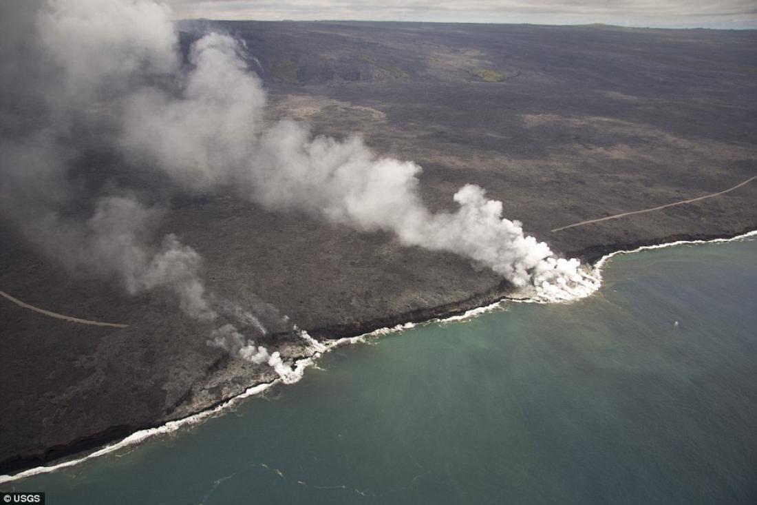 Οι ροές λάβας που πέφτουν από τον κρατήρα Puʻu ʻŌʻō στο ανατολικό ρήγμα του Kilauea στον ωκεανό Kamokuna προκαλούν τεράστια λοφία ατμού.