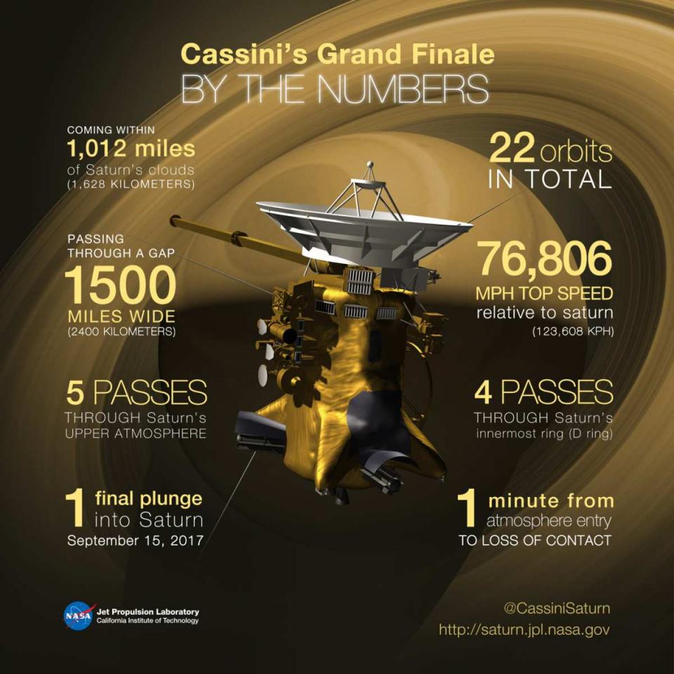 Με τον τρόπο αυτό, θα ολοκληρωθεί η τελική φάση της αποστολής του, γνωστής και ως «μεγάλο φινάλε», που άρχισε στις 22 Απριλίου, όταν το σκάφος δέχθηκε βαρυτική ώθηση από τον δορυφόρο Τιτάνα και άρχισε μια σειρά από διαδοχικές ολοένα πιο κοντινές διελεύσεις κοντά στον αέριο γίγαντα με τους θεαματικούς δακτυλίους.