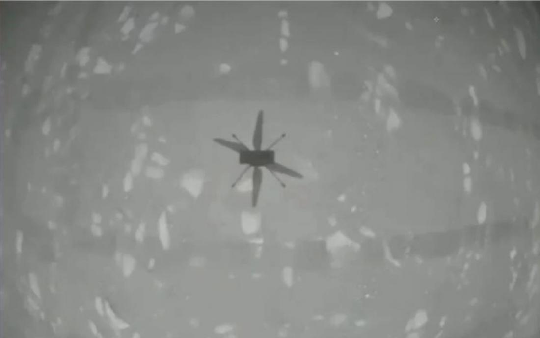 To Perseverance, ένας εξάτροχος ρομποτικός γεωλόγος με κύρια αποστολή την αναζήτηση ενδείξεων αρχαίας ζωής στον Άρη, βιντεοσκόπησε το ελικοπτεράκι να απογειώνεται από την ερημική επιφάνεια και να μένει μετέωρο για μερικά δευτερόλεπτα πριν επιστρέψει στο ίδιο σημείο.