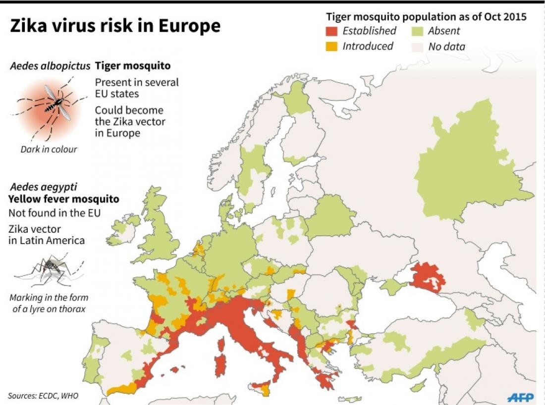Σύμφωνα με τον ΠΟΥ, εάν δεν ληφθούν μέτρα για να περιοριστεί η απειλή στην Ευρώπη, η παρουσία των κουνουπιών-τίγρεων που μπορεί να είναι φορείς του ιού σημαίνει ότι η πιθανότητα μιας τοπικής εμφάνισης του Ζίκα είναι "μέτρια" σε 18 ευρωπαϊκές χώρες, μεταξύ των οποίων η Γαλλία, η Ιταλία, η Μάλτα, η Κροατία, η Ισπανία, η Τουρκία, η Ελλάδα, η Βουλγαρία, η Ρουμανία και η Αλβανία. Σε άλλες 36 χώρες η πιθανότητα είναι μικρή, πολύ μικρή ή ανύπαρκτη (όπως στην Ισλανδία και τη Φινλανδία) γιατί τα κουνούπια-τίγρεις δεν ζουν σε αυτές και το κλίμα τους δεν είναι κατάλληλο για να αναπαραχθεί το κουνούπι.