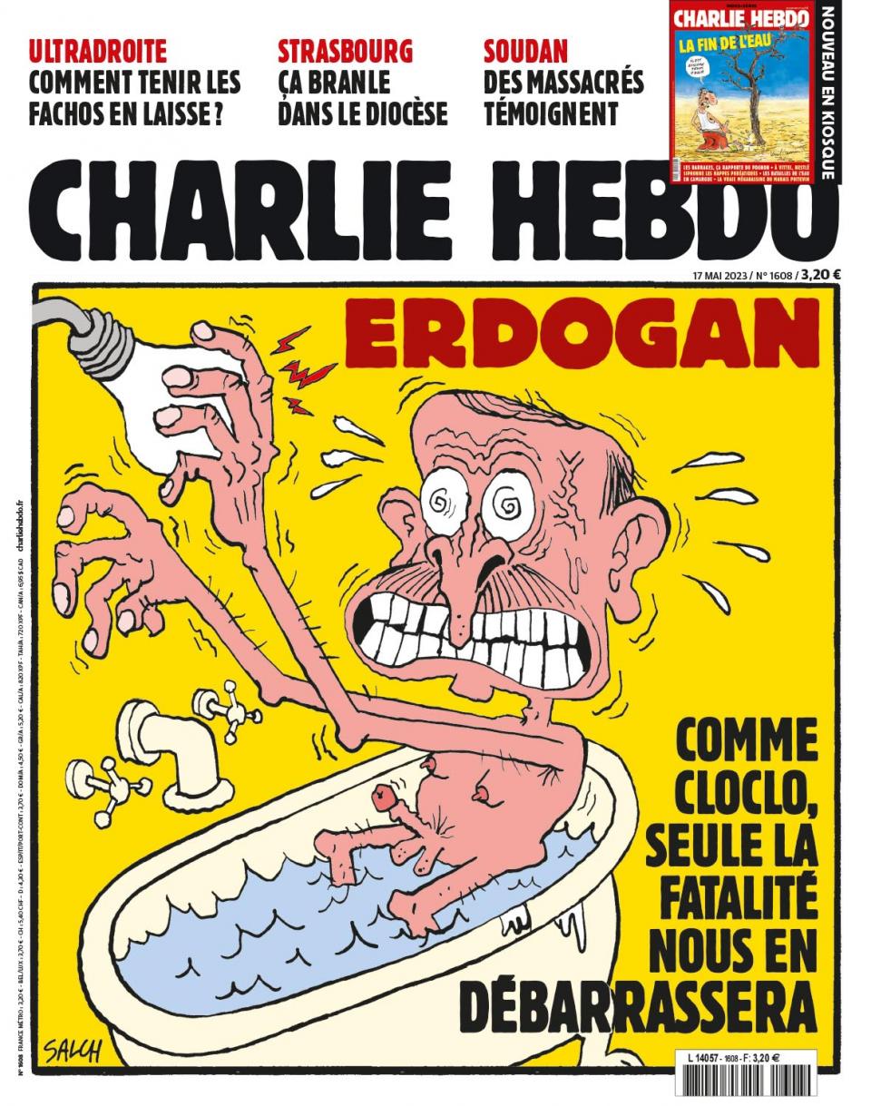 Οργή έχει προκαλέσει στην Άγκυρα το εξώφυλλο του γαλλικού περιοδικού Charlie Hebdo κατά του Ταγίπ Ερντογάν, με τις αντιδράσεις των στελεχών του Τούρκου προέδρου να μην κοπάζουν. Με τον Τούρκο πρόεδρο γυμνό σε μια μπανιέρα να παθαίνει ηλεκτροπληξία και τη λεζάντα «Εντογάν, μόνο η μοίρα μπορεί να τον εξαφανίσει» κυκλοφόρησε σήμερα το νέο εξώφυλλο του Charlie Hebdo. Το εξώφυλλο αναφέρεται στην νίκη του Ερντογάν στον α’ γύρο των βουλευτικών εκλογών.