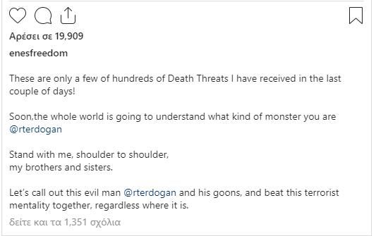 Ο πρώην σταρ του NBA, ο οποίος δεν έχει διστάσει να ασκήσει δριμύτατη κριτική στον Τούρκο πρόεδρο για τις πρακτικές του σχετικά με ανθρώπινα δικαιώματα στη χώρα του, πλέον έρχεται αντιμέτωπος με σοκαραστικά μηνύματα χρηστών στα social media.