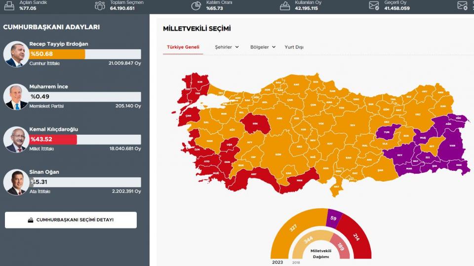 Με καταμετρημένο το 78,93% των ψήφων, ο Ερντογάν συγκεντρώνει το 50,74% με την τάση να είναι ελαφρώς πτωτική. Ως εκ τούτου, το ερώτημα είναι το κατά πόσο ο Τούρκος πρόεδρος θα υπερβεί τον πήχυ του 50%. Με άλλα λόγια, αν ο Ερντογάν θα εκλεγεί πρόεδρος από απόψε ή θα υπάρχει δεύτερος γύρος.