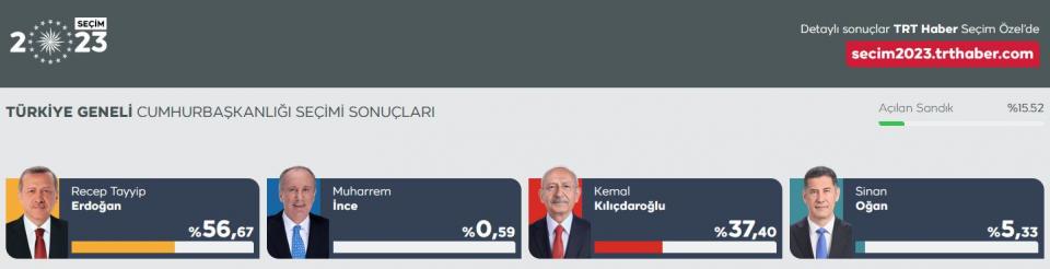 Ταγίπ Ερντογάν 56,67%, Κεμάλ Κιλιτσντάρογλου 37,40%.