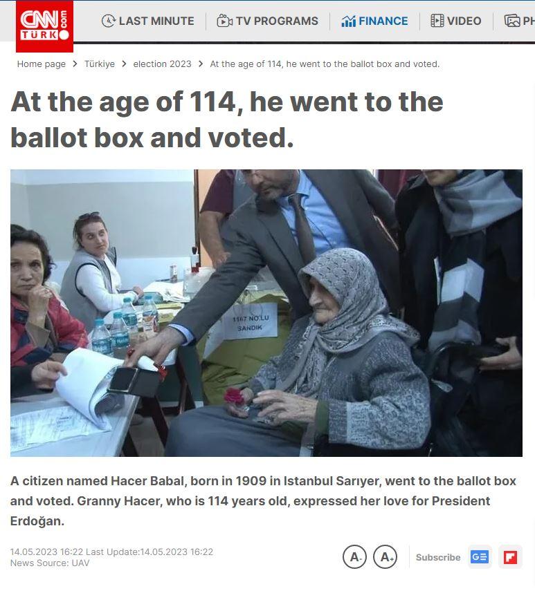 Η Χασέρ Μπαμπάλ γεννήθηκε το 1909 στην Κωνσταντινούπολη. Σήμερα, πήγε στην κάλπη και ψήφισε. Στα 114 της χρόνια, εξέφρασε την αγάπη της για τον Ερντογάν.