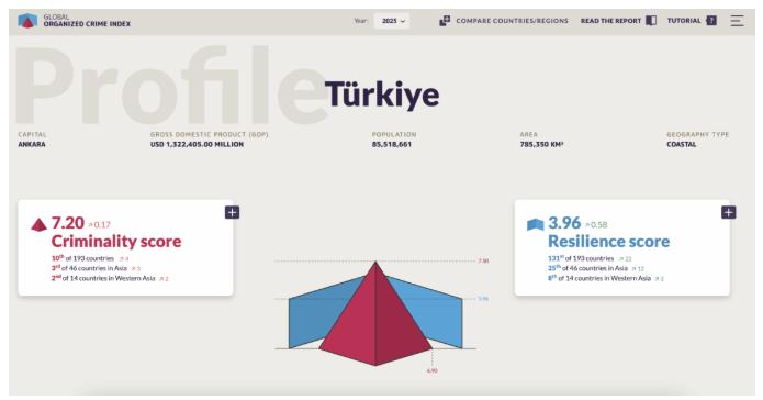 Με βάση τα στοιχεία του Global Initiative Against Transnational Organized Crime, που παραθέτει το Nordic Monitor, η Τουρκία συγκαταλέγεται το 2025 στις δέκα πιο επιβαρυμένες χώρες παγκοσμίως σε οργανωμένο έγκλημα, με βαθμολογία 7,20 στη «βαθμίδα εγκληματικότητας» και μόλις 3,96 στην «ανθεκτικότητα» — ένδειξη ότι οι θεσμοί δεν αντιστέκονται αλλά υποχωρούν. Η χώρα λειτουργεί, κατά το ρεπορτάζ, όχι μόνο ως πέρασμα κοκαΐνης αλλά και ως κόμβος για ηρωίνη (βαλκανική οδός), captagon, πλαστά προϊόντα, λαθρεμπόριο όπλων και διακίνηση ανθρώπων. Το οργανωμένο έγκλημα δεν έχει απλώς διεισδύσει στο κράτος. Συνεργάζεται μαζί του.
