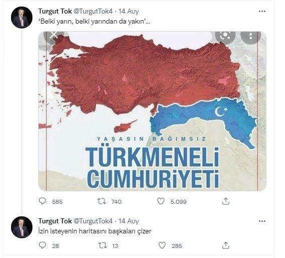 Με ανάρτησή του στο twitter ο Τοκ δείχνει ένα χάρτη στον οποίο εμφανίζονται ως τουρκικά σχεδόν όλα τα νησιά του Αιγαίου, η Κρήτη και η Κύπρος. Ακόμα στον χάρτη εμφανίζονται ως τουρκικά εδάφη της βόρειας Συρίας, (αυτά που είναι με μπλε χρώμα στην φωτογραφία στην αρχή του κειμένου).