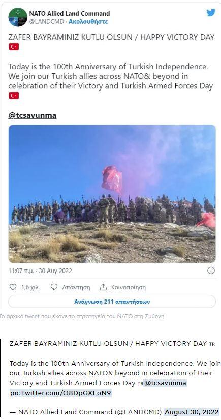 Μετά το αυστηρό διάβημα προς τον γενικό γραμματέα του ΝΑΤΟ, Γενς Στόλτενμπεργκ, το στρατηγείο του ΝΑΤΟ στη Σμύρνη, κατέβασε την προκλητική ανάρτησή του στο Twitter, με το οποίο έδινε συγχαρητήρια στην Τουρκία για την εορτή της «Ημέρας της Νίκης», που ταυτίζεται με την Μικρασιατική Καταστροφή και την εκδίωξη του Ελληνισμού από τα πατρογονικά εδάφη της Μικράς Ασίας.