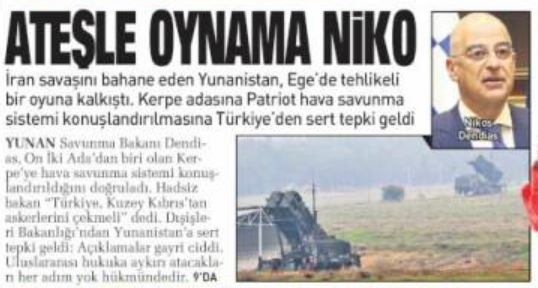 Αναφορά στον υπουργό Εθνικής Άμυνας της Ελλάδας, Νίκο Δένδια, κάνει η τουρκική εφημερίδα Sabah, η οποία κυκλοφορεί με πρωτοσέλιδο τίτλο «Μην παίζεις με τη φωτιά, Νίκο», αποτυπώνοντας την έντονη αντίδραση της Άγκυρας στη μεταφορά συστοιχίας πυραύλων του αντιαεροπορικού συστήματος Patriot στην Κάρπαθο.