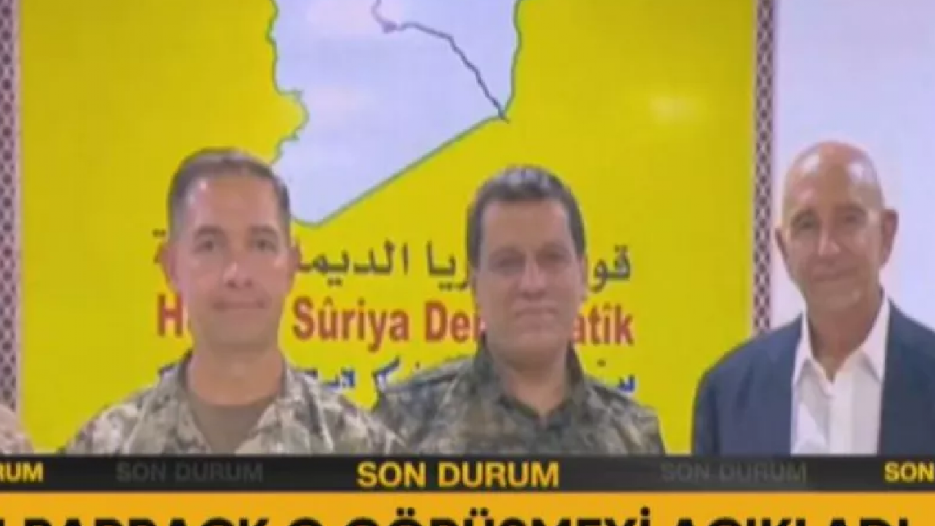 Γιουνούς Πακσόι, ανταποκριτής CNN TURK στην Ουάσινγκτον: Ναι, υπάρχει αντίδραση στη φωτογραφία αυτή, δικαιολογημένα μπορεί να προκαλέσει αντιδράσεις. Έχει φωτογραφηθεί και έχουν ποζάρει θερμά. Αυτή εδώ είναι η σημαία του SDG (των κουρδικών δυνάμεων). Αυτό το κουρέλι. Αλλά εδώ προκαλούνται αντιδράσεις επειδή η τουρκική πόλη του Χατάι εμφανίζεται εντός των συνόρων της Συρίας. Εκεί επίσης λένε πως υπάρχει ένα ποτάμι, αλλά κανονικά οι άνθρωποι χάραξαν τα σύνορα τους και λένε 'αυτό εδώ το σημείο είναι δικό μας'. Δηλαδή η περιοχή ανατολικά του Ευφράτη είναι δική μας. Ο Τομ Μπάρακ είναι ειδικός απεσταλμένος στη Συρία, αλλά είναι και πρέσβης των ΗΠΑ στην Τουρκία και πάει και φωτογραφίζεται μπροστά σε αυτόν εδώ τον χάρτη!».