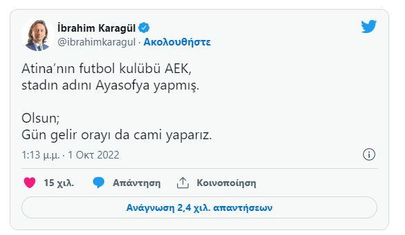 Ο Τούρκος δημοσιογράφος, Ιμπραήμ Καραγκιούλ, έγραψε στο Twitter: «Το γήπεδο της ΑΕΚ ονομάστηκε "Αγία Σοφία", μια μέρα θα το κάνουμε τζαμί».