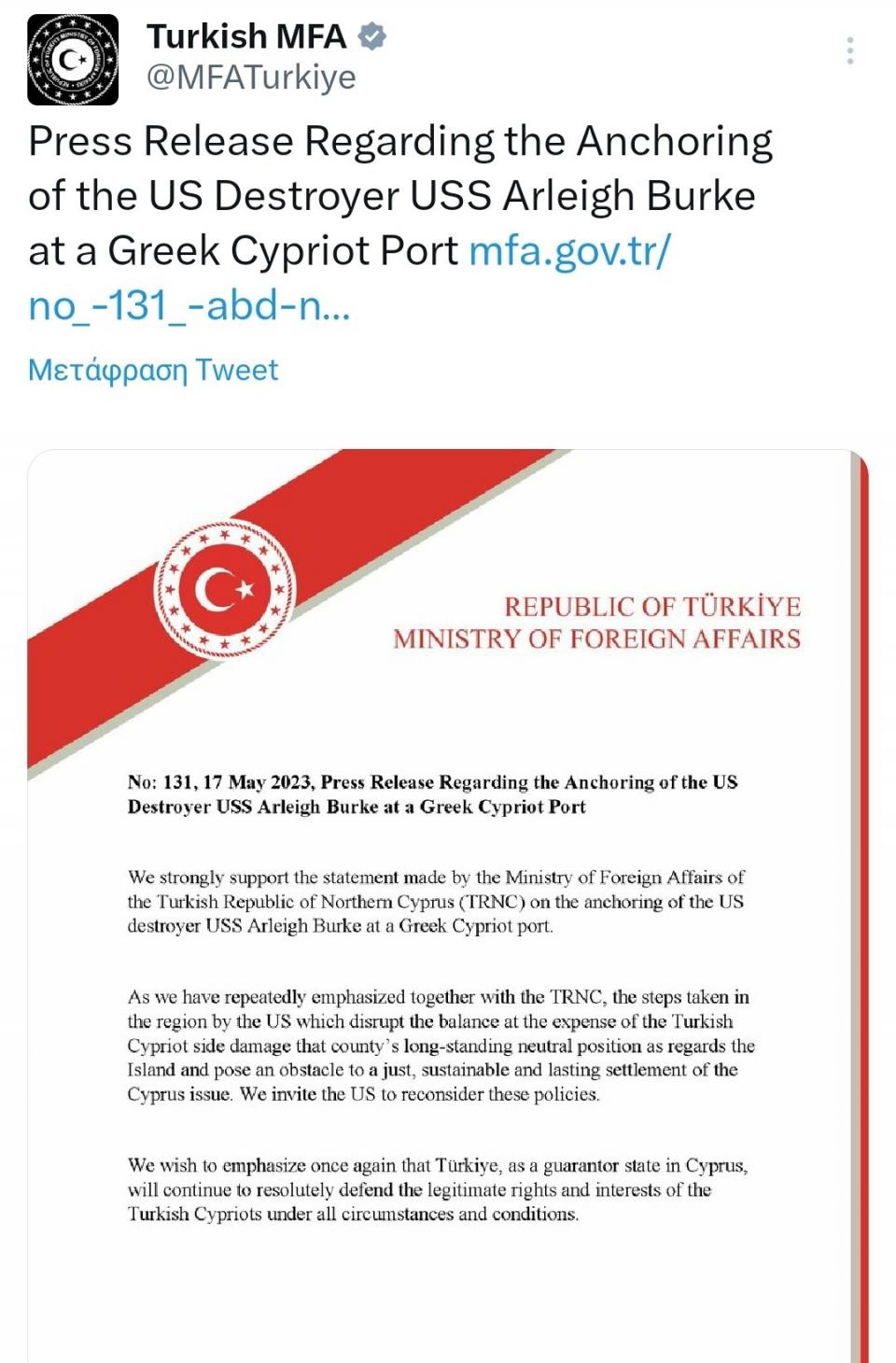 Το γεγονός αυτό, του κατάπλου δηλαδή ενός πυραυλοφόρου αντιτορπιλλικού, αμέσως μετά από αυτόν ενός πυρηνοκίνητου υποβρυχίου σε λιμάνια της Κυπριακής Δημοκρατίας, αλλά και η όλη διαφαινόμενη στάση των Αμερικανών να ενισχύσουν έτι περαιτέρω την αμερικανοκυπριακή συνεργασία σε μία ασταθή γεωστρατηγικά περιοχή, με πολλαπλά προβλήματα, φαίνεται ότι ενόχλησε σφόδρα την Άγκυρα, η οποία με επίσημη ανακοίνωση του Υπουργείου Εξωτερικών της 17ης Μαΐου διαμαρτύρεται για τον κατάπλου του αμερικανικού πολεμικού σε «ελληνοκυπριακό λιμάνι», όπως αποκαλεί το λιμάνι της Κυπριακής Δημοκρατίας που κατέπλευσε αυτό, ενώ σπεύδει να υποστηρίξει την ανακοίνωση διαμαρτυρίας που εξέδωσε το υποτιθέμενο «υπουργείο Εξωτερικών» του ψευδοκράτους στα κατεχόμενα. Και προσθέτει η ανακοίνωση του τουρκικού ΥΠΕΞ κατηγορώντας τις ΗΠΑ ότι με ενέργειες σαν και αυτές «…διαταράσσει τις ισορροπίες στην περιοχή», ζητώντας παράλληλα «να αναθεωρήσει τις πολιτικές της».