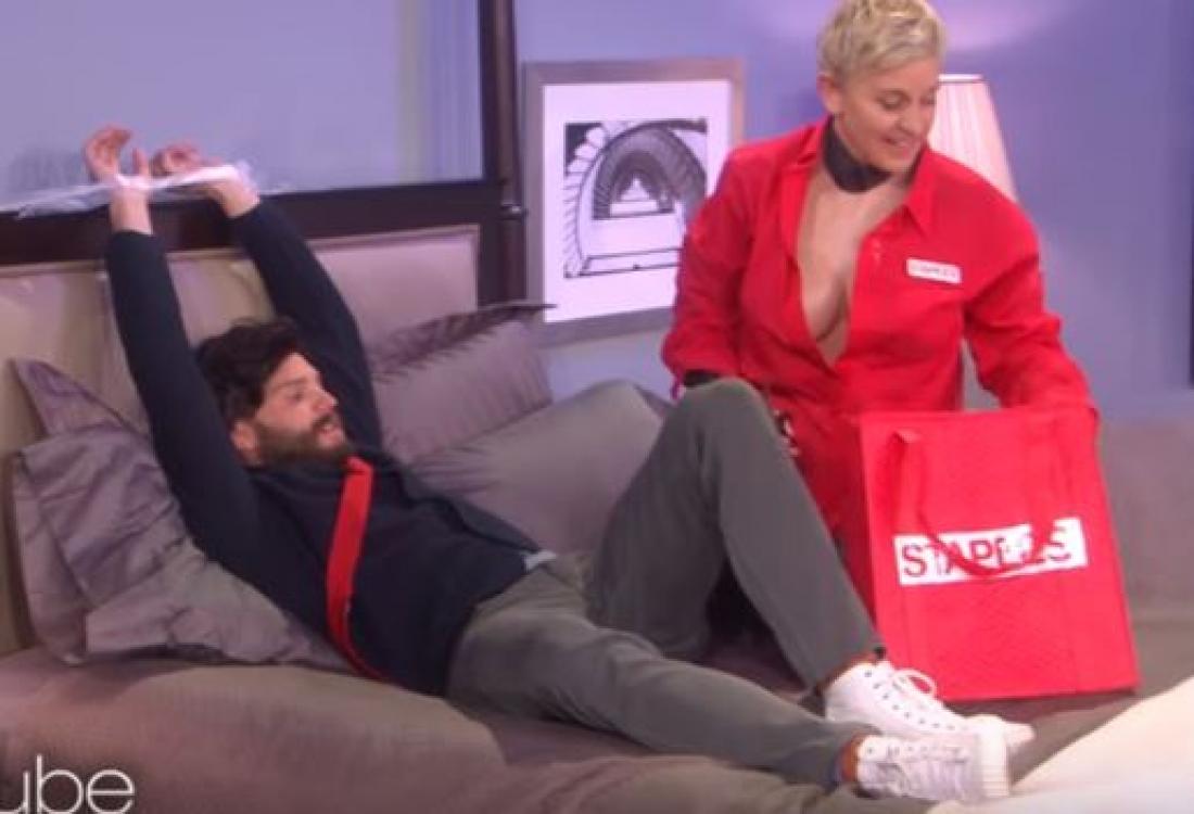 Εκμεταλλευόμενη την παρουσία του γοητευτικού της καλεσμένου, του Ιρλανδού Jamie Dornan, ο οποίος πρωταγωνιστεί στη διάσημη σέξι τριλογία ταινιών ως ο... αυταρχικός κύριος Γκρέι, η Ellen αποφάσισε να αντιστρέψει τους ρόλους...