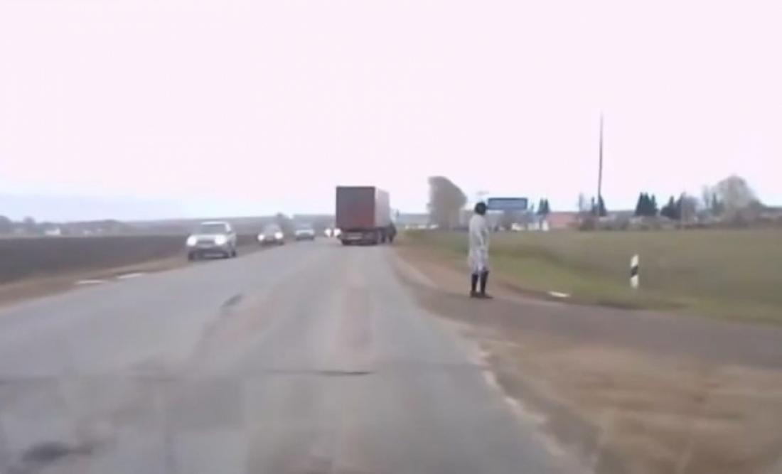 Ο άνδρας φορά εργαστηριακή ιατρική ποδιά και εμφανίζεται ξαφνικά στη μέση ενός πολυσύχναστου αυτοκινητόδρομου. Μάλιστα οδηγός νταλίκας που το βλέπει αιφνιδίως μπροστά του καταφέρνει να τον αποφύγει την τελευταία στιγμή.