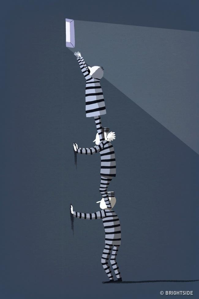 Τρεις φυλακισμένοι σκοπεύουν να αποδράσουν από το κελί τους. Για να σκαρφαλώσουν, ανεβαίνουν ο ένας στους ώμους του άλλου, αλλά αυτός που είναι στην κορυφή απέχει ακόμα μερικά εκατοστά από το παράθυρο. Τι πρέπει να κάνουν για να αποδράσουν;