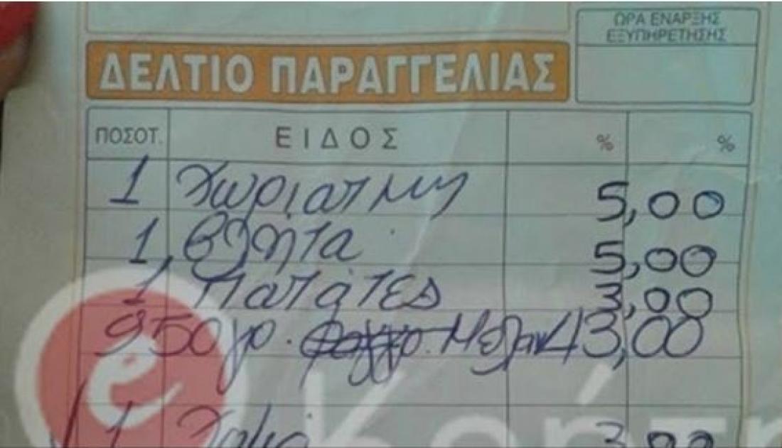 Όταν ήρθε η ώρα να πληρώσουν... ούτε λόγος για απόδειξη ! Ο υπεύθυνος τους έδωσε το δελτίο παραγγελίας και εκείνοι του έδωσαν τα χρήματα. Έφυγαν με το δελτίο παραγγελίας ανά χείρας που κάνει το γύρο του διαδικτύου. Με πολλούς χρήστες να σχολιάζουν την ορθογραφία του μαγαζάτορα και άλλοι να στέκονται στην ουσία της φοροδιαφυγής..