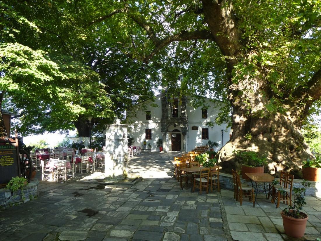 Η πλακόστρωτη πλατεία του χωριού σκεπάζεται από γιγαντιαίες τηλιές οι οποίες απλώνουν προστατευτικά την σκιά τους πάνω από την πλατεία και την εκκλησία της Αγίας Τριάδας. Η εκκλησία αυτή είναι ένα έξοχο δείγμα βασιλικής με θαυμάσιο διάκοσμο και ένα ξυλόγλυπτο εικονοστάσι απαράμιλλης τέχνης και καλαισθησίας.