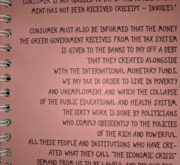«Ο καταναλωτής πρέπει επίσης να γνωρίζει ότι τα χρήματα που η ελληνική κυβέρνηση λαμβάνει από το φορολογικό σύστημα δίνεται στις τράπεζες για να πληρώσουν ένα χρέος που οι ίδιες δημιούργησαν μαζί με το Διεθνές Νομισματικό Ταμείο...