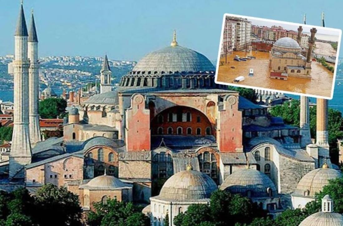 Άλλωστε, δεν θα ήταν το πρώτο σημάδι. Προ ημερών κατέρρευσε ξαφνικά μέρος των τειχών της Βασιλεύουσας στην περιοχή Karagümrük Mahallesi, προκαλώντας διακοπή της κυκλοφορίας. Και δεν ήταν μόνο αυτά… Το ίδιο διάστημα στη γενέτειρα του Ερντογάν, στην επαρχία Ριζούντα του Πόντου, άνοιξαν οι ουρανοί και πλημμύρισαν τα πάντα! Αυτές οι «περίεργες» συμπτώσεις έχουν κάνει τους Τούρκους -και όχι μόνο τους προληπτικούς- να λένε ότι η βεβήλωση της Αγια-Σοφιάς δεν θα βγει σε καλό.